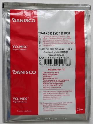 9. 儲(chǔ)存條件:酸奶菌種YO-MIX 300 LYO 100 DCU是直投式凍干菌種,儲(chǔ)存在4℃以下,保質(zhì)期為18個(gè)月。儲(chǔ)存在-18℃或-18℃以下,保質(zhì)期為24個(gè)月。
